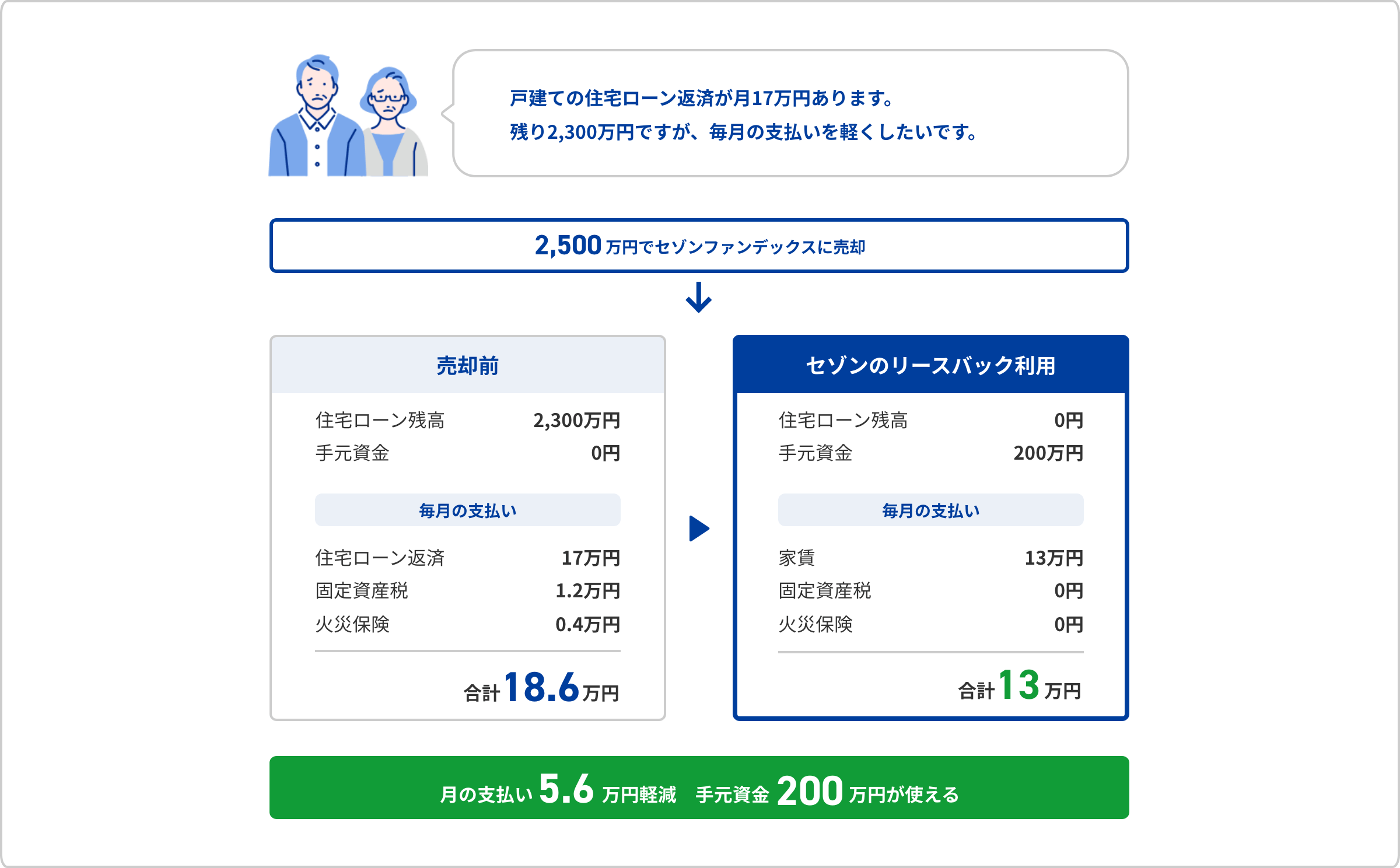 自宅を売却し、売却代金を一括で受け取る。 売却と同時に賃貸借契約を締結し、毎月家賃を支払う。 |