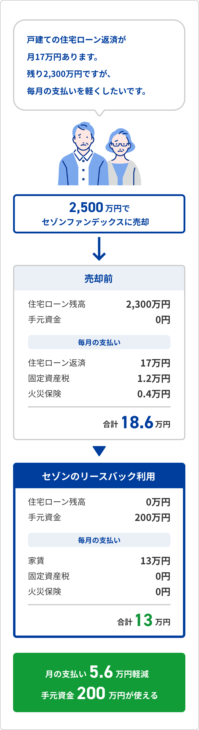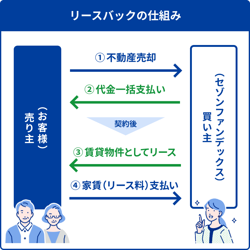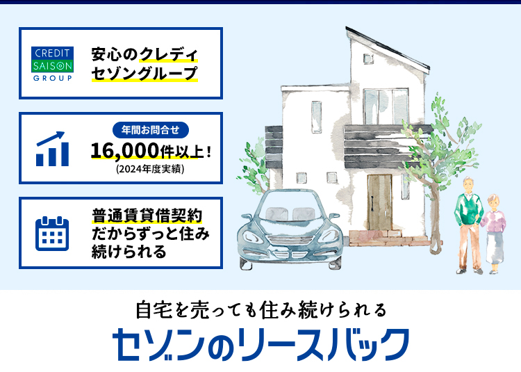 住み慣れた自宅で生活しながら、まとまった資金を調達することが可能です。セゾンのリースバックでは、お客さまの大切なご自宅をセゾンファンデックスが直接買い取り、お客さまは賃貸としてそのまま住み続けていただけます。
