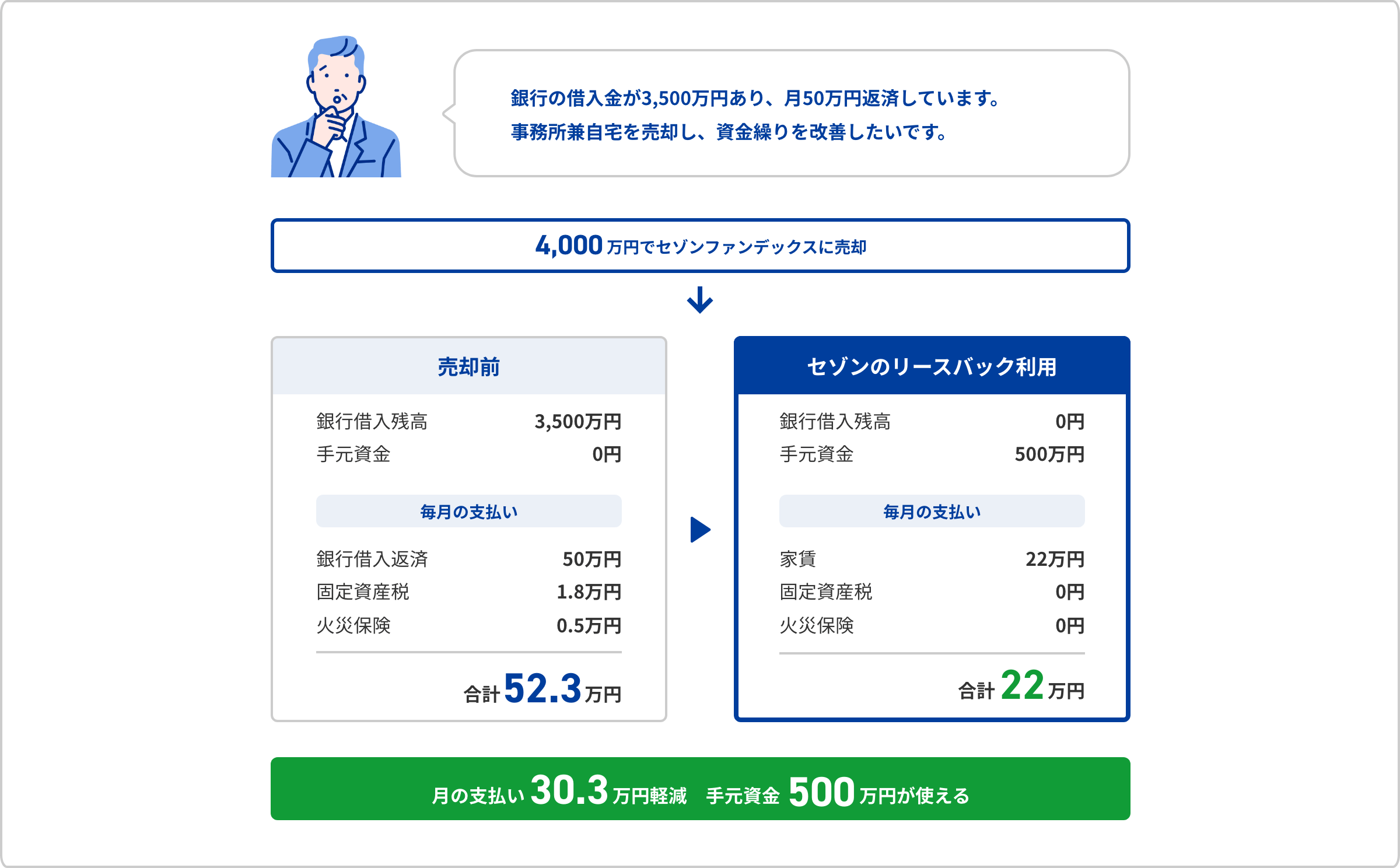 - 事業用不動産は所有していないが、リースバックで自宅を売却して得た資金で事業ローンの借入れや滞納していた税金を支払うことができた