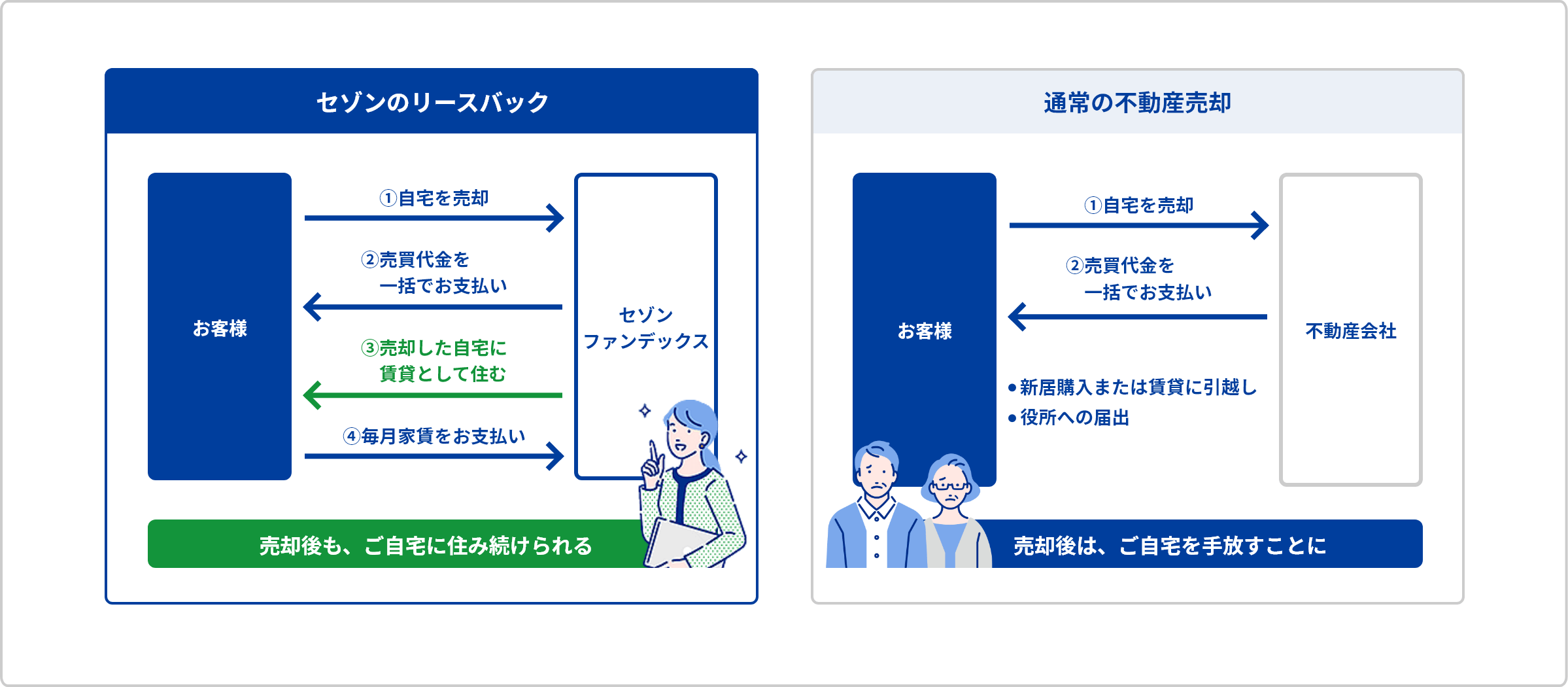 通常の不動産売却では、売却後はご自宅を手放し、新居の購入や賃貸に引越さなければなりません。