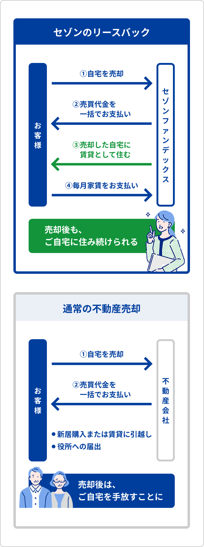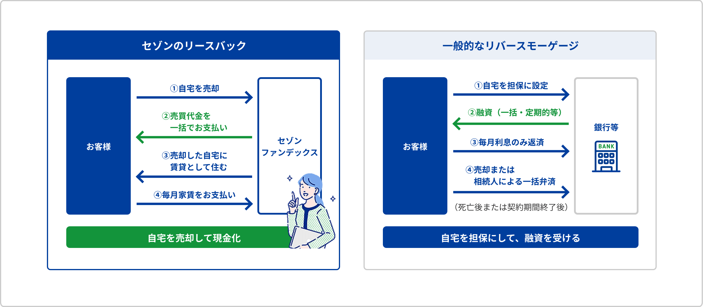 リースバックとリバースモーゲージは、ご自宅に住みながら資金を調達できる点は同じですが、仕組みや特徴が全く違います。ここでは、セゾンのリースバックと金融機関で一般的に扱われているリバースモーゲージの違いについてわかりやすく図説しています。